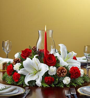 Christmas greens with hurricane fresh cut lily and assorted xmas